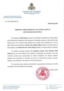 ឯកឧត្តមរដ្ឋមន្ត្រីការបរទេសកម្ពុជា អញ្ជើញទៅបំពេញទស្សនកិច្ចផ្លូវការ នៅប្រទេសនូវែលសេឡង់ និងអូស្ត្រាលី CAMBODIA’S FOREIGN MINISTER TO PAY OFFICIAL VISITS TO NEW ZEALAND AND AUSTRALIA